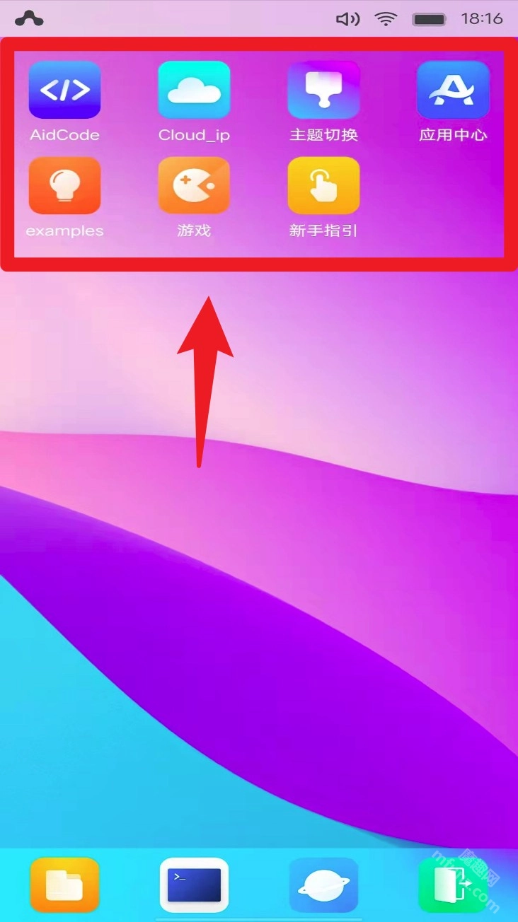桌面上方的应用区域里有AidCode、Cloud_ip、主题切换等图标,点击这些图标就能快速进入相应的功能。
