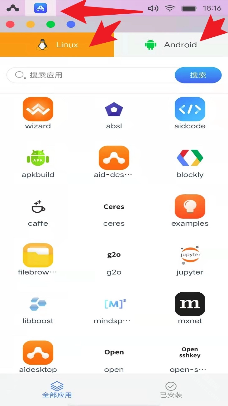应用列表页面支持在「Linux / Android」生态系统间切换,用户可以通过搜索框查找应用,也能浏览「全部应用」和「已安装」这两个分类。
