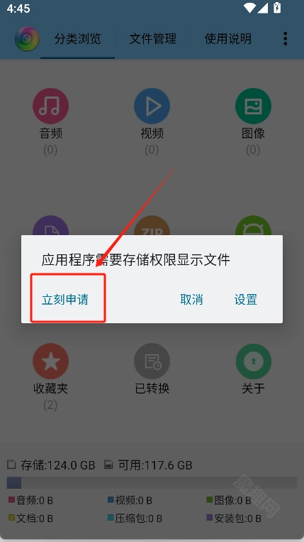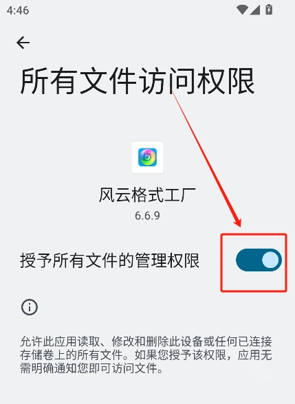 在转换完成后弹出的窗口里,点击“立即申请”选项,然后开启授予权限的按钮。