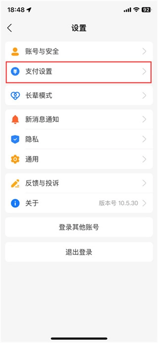接着进入设置页面,这里有账号安全、支付设置、长辈模式、隐私等功能选项,我们点击其中的【支付设置】。
