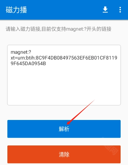 安装完成后打开磁力播,授予存储和网络权限。可以粘贴磁力链接或ED2K链接,也能点击“导入种子”选择本地的种子文件,之后点击“解析”按钮并等待解析完成。