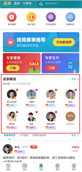 名人专家凭借自身专业能力,对比赛展开全方位、多层次的专业分析,并提供赛果推荐服务。当前该服务涵盖足球和篮球两类赛事解读,其中足球赛事支持胜负彩、任选9场以及竞彩足球(包含单关、亚盘、大小球和混合玩法);篮球赛事则支持竞篮胜负、让分胜负、大小分、胜分差与混合玩法。