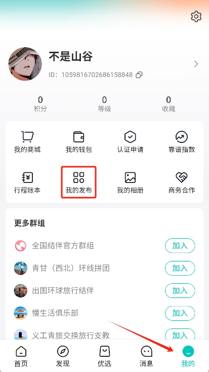 进入“我的”页面,点击“我的发布”选项,即可查看并管理自己已发布的旅行计划。