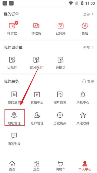 打开震坤行工业超市后,点击页面底部的“个人中心”。