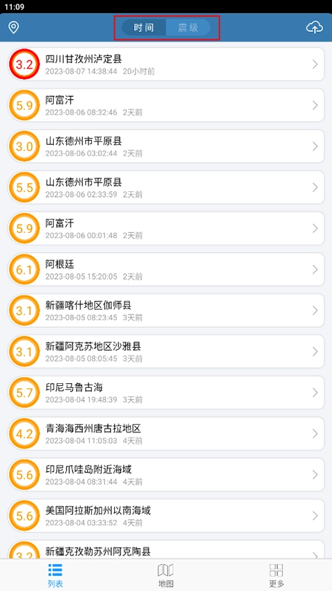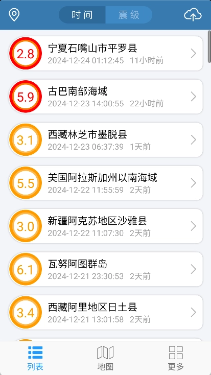在“列表”页面,我们能够依据时间和震级来查找感兴趣的地区。