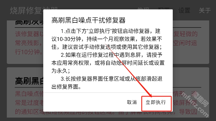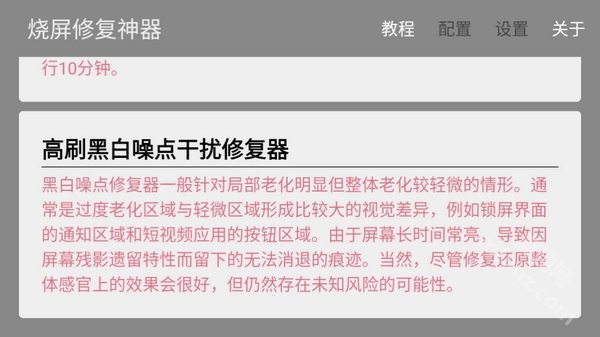 这款App新增了屏幕烧伤修复功能,可通过滚动黑白条纹或其他色彩的噪点图案,尝试让屏幕恢复到原本的显示状态。