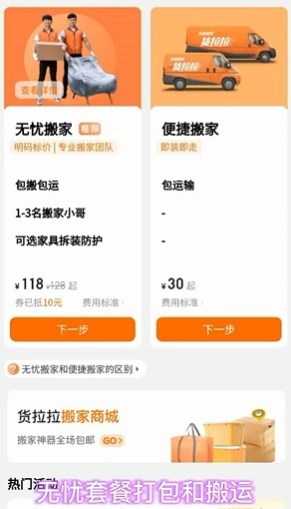 选择搬家类型:货拉拉推出了无忧套餐与便捷套餐两种搬家方案。无忧套餐涵盖打包和搬运服务,全程由师傅负责操作,因此费用会稍高一些;便捷套餐则需要用户自行打包,搬运环节可自主选择自己动手或由师傅帮忙,该套餐性价比更优,是大多数人的选择。