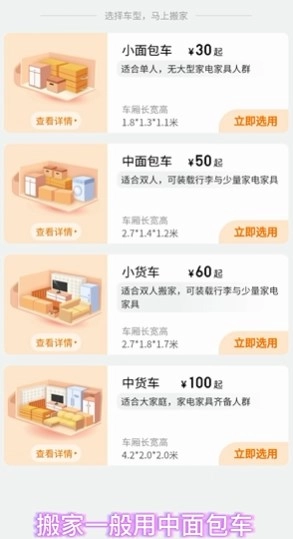选择车型时,可依据物品数量来挑选合适的车型。若物品较少,中面包车是不错的选择;要是物品较多,或者有冰箱这类大家电,那么小货车会更合适。