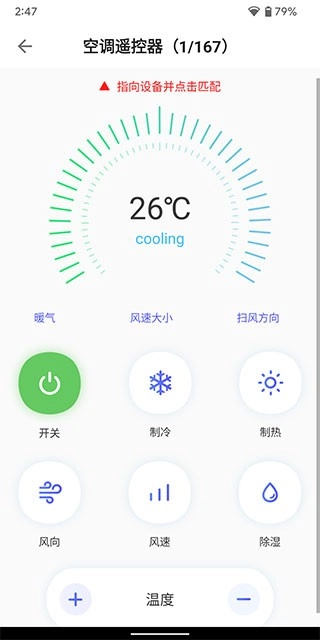 然后用手机对准空调,按下手机上的虚拟按键,检查开机键是否能正常工作。