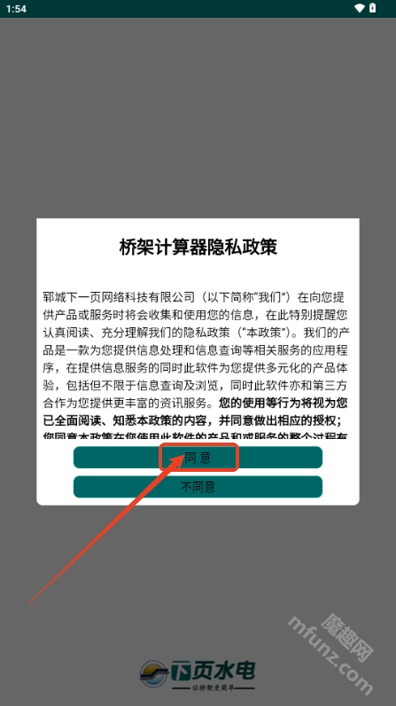 在魔趣网(m.mfunz.com)找到并安装桥架计算器,点击“同意”按钮进入软件。