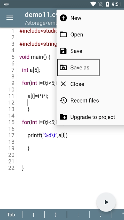 把要执行的代码输入进去,点击文件夹形状的图标,选择“另存为”选项,给c文件起好名字并保存,要留意文件后缀的填写。