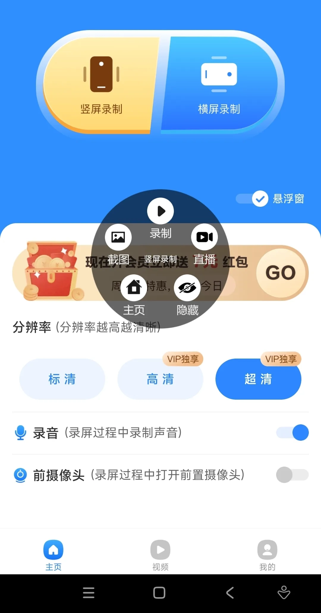 悬浮窗集成了截图、录屏、直播等功能,点击“录制”按钮即可启动屏幕录制。