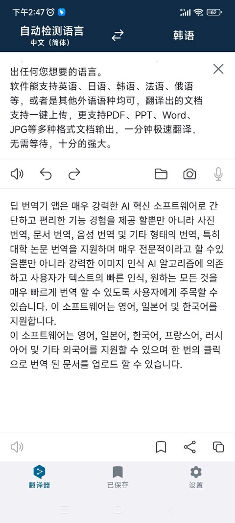 文档翻译操作步骤如下:点击“选择文档”按钮,导入待翻译的文档后,应用便会对文档内的全部内容进行翻译处理。