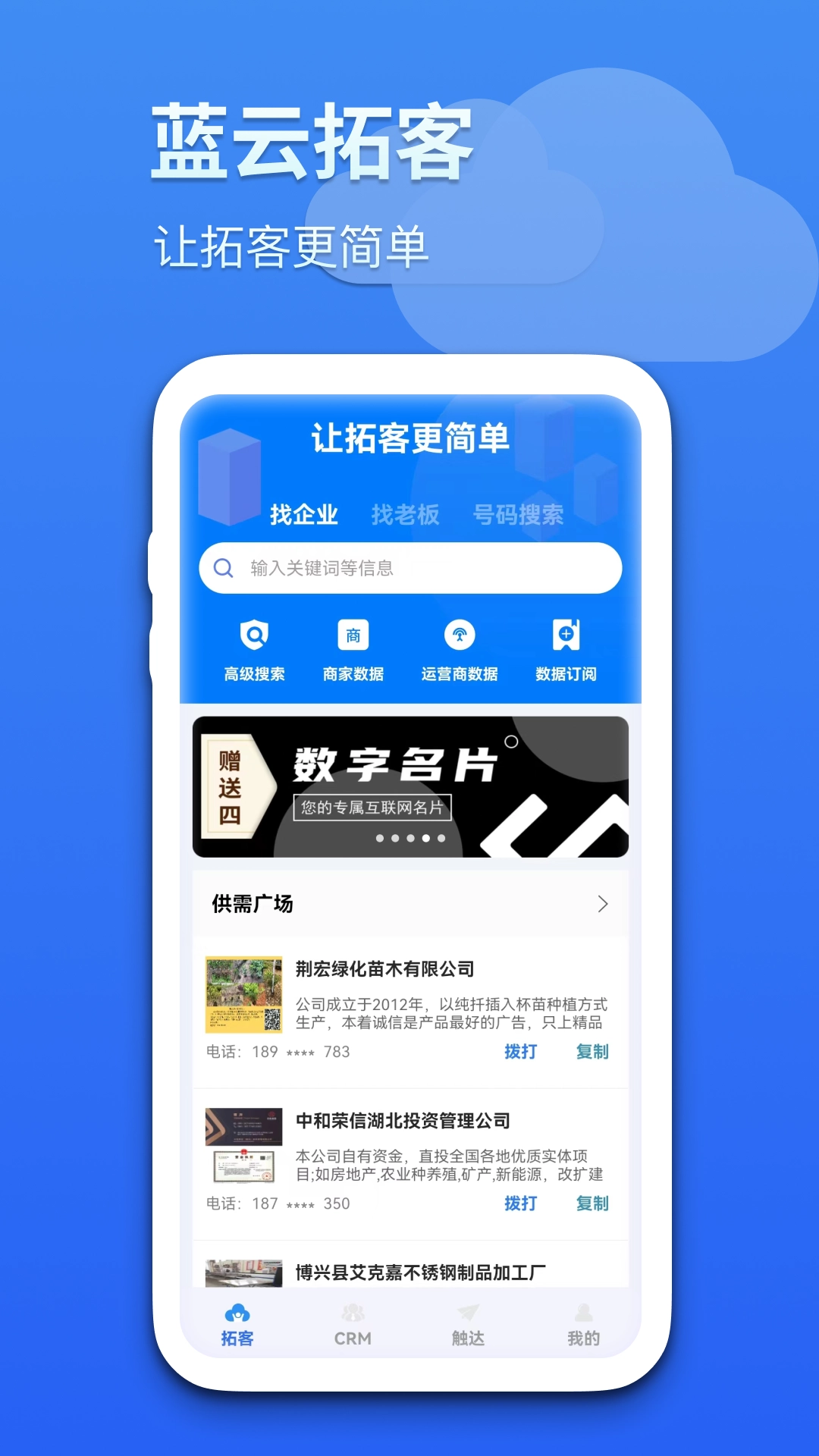 蓝云拓客是一款手机端的拓客工具,的CRM系统能帮你轻松管理客户,实现实时跟进;你还可以通过它一键搜索客源,便捷地了解和跟进客户信息,从而有效提升销售效率与业绩。借助蓝云拓客,我们不仅能更好地管理客户信息,还能挖掘更多潜在渠道和商机。