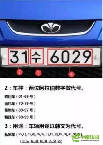 韩国的车牌与日本的颇为相似,私家车车牌相比商用车车牌,会少显示一项关于用途的信息;其中,私家车车牌采用白底黑字的样式,商用车车牌则为黄底黑字。