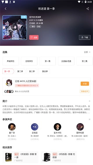 《将进酒》广播剧评分99分,姜广涛为沈兰舟配音,袁铭喆演绎萧驰野,改编自唐酒卿的原著作品,完全可以归入“原著与广播剧双精品”的行列!这部剧在我心中是猫儿(袁铭喆)表现最出色的广播剧作品——配音团队整体水准在线,百万级别的后期制作诚意满满,听剧过程中无论是场景转场的流畅、BGM的适配,还是各种细节处理的细腻与舒适感,都让人挑不出毛病;每一季的主题曲也都十分动听,各个方面都令人满意。至于原著本身的优秀更是无需多言,它在我心里一直是古耽领域当之无愧的TOP1。