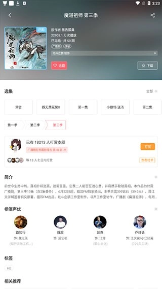 《魔道祖师》评分高达95分,魏无羡由路知行配音,蓝忘机则是魏超献声,原著作者是墨香铜臭。无论是原著小说还是广播剧,都堪称精品系列!这部作品可是猫耳FM的镇殿之作,收听率稳居第一。它的品质自然是顶尖的,制作十分精良,配音团队更是大咖云集,也是我接触广播剧的入门之作。不过因为原著我刷了太多遍,里面的台词和情节都记得清清楚楚,所以广播剧买来后只听了一遍,到现在都没来得及二刷。我身边不少朋友却一直在循环播放这部剧,尤其是听到第三季时,几乎每晚都会感动得流泪。