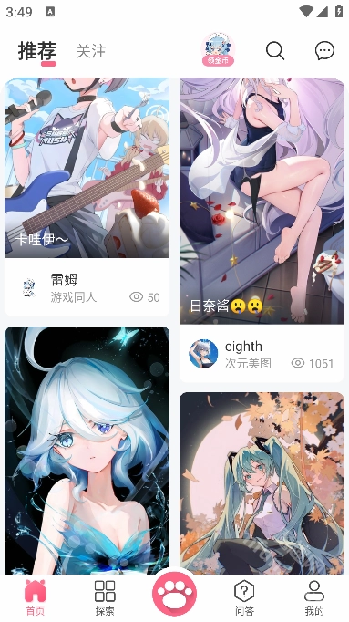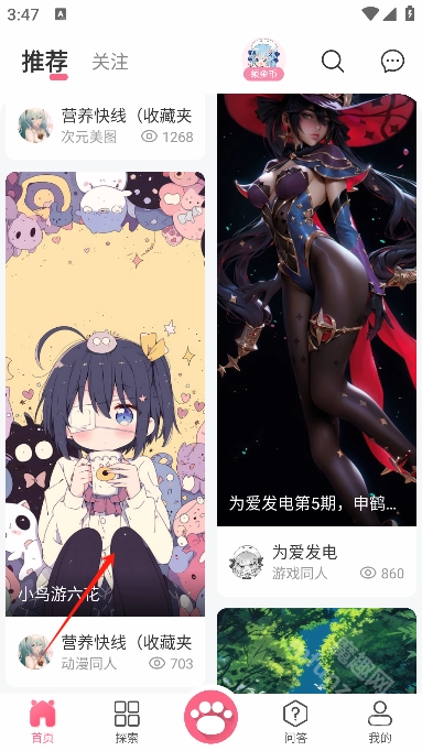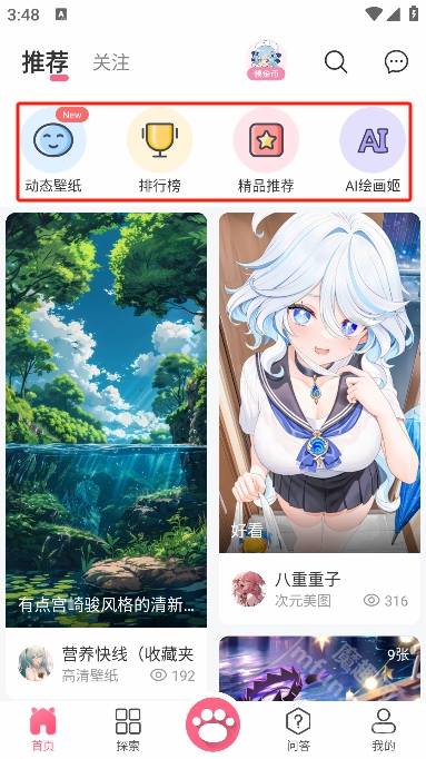 在推荐界面,你会看到几个特色板块,分别是排行榜、精品推荐、动态壁纸和AI绘画姬。