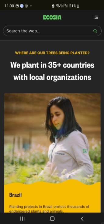 Ecosia借助搜索广告所获利润,在全球三十多个国家开展植树行动,以此抵消自身的碳足迹。