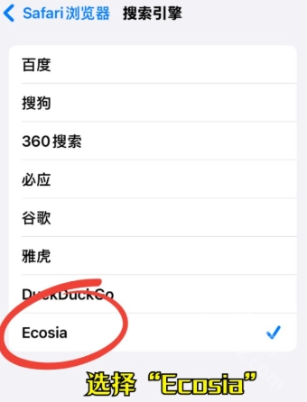 选择“搜索引擎”选项,接着把Ecosia设为默认搜索引擎