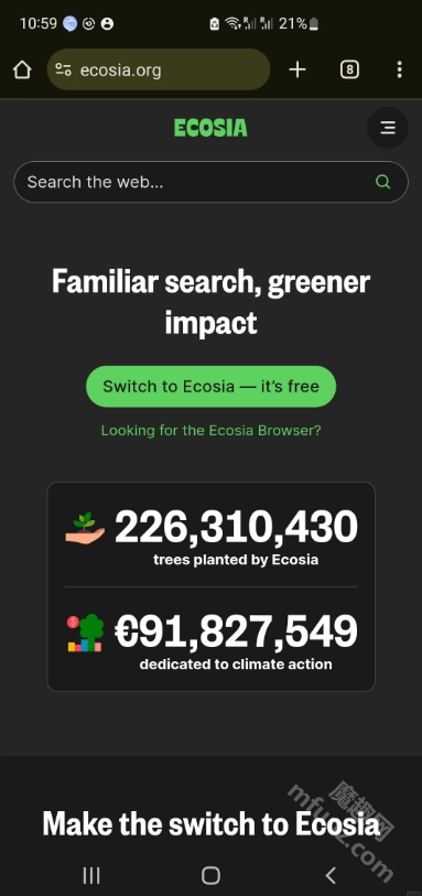 直接打开Ecosia App并执行搜索操作,就能体验Ecosia的环保搜索服务,也可以在下列浏览器中完成相关设置。