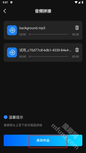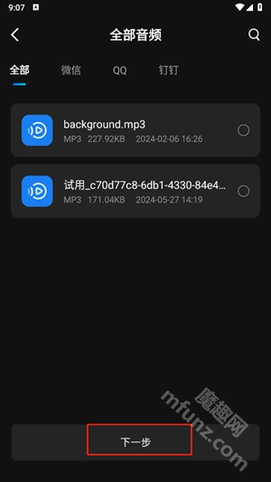 以音频拼接为例,挑选好要进行拼接的音频文件后,点击“下一步”按钮即可。
