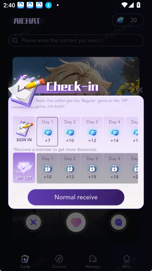 lolipop 是专为二次元爱好者设计的AI聊天应用,用户每日签到能领取普通宝石或VIP宝石,但两者不可兼得;通过搜索框可查找所需内容,底部设有卡片、发现、消息和我的四个功能板块,还能与数百位风格各不相同的AI角色进行实时互动交流。