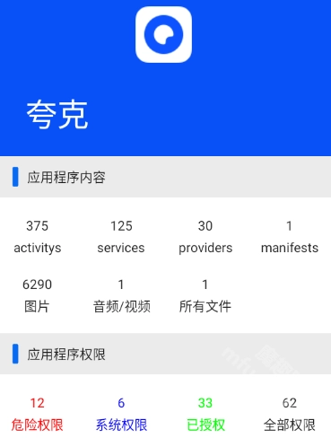 应用程序的内容,以及其危险权限、系统权限、已授权权限和全部权限