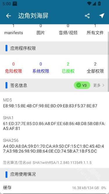 支持查看APK的各类信息,包括包名、安装日期、升级日期、占用空间、版本号、安装位置、使用统计信息、服务、权限、硬件要求、APK资源、证书签名MD5、进程名、UID以及签名信息等。