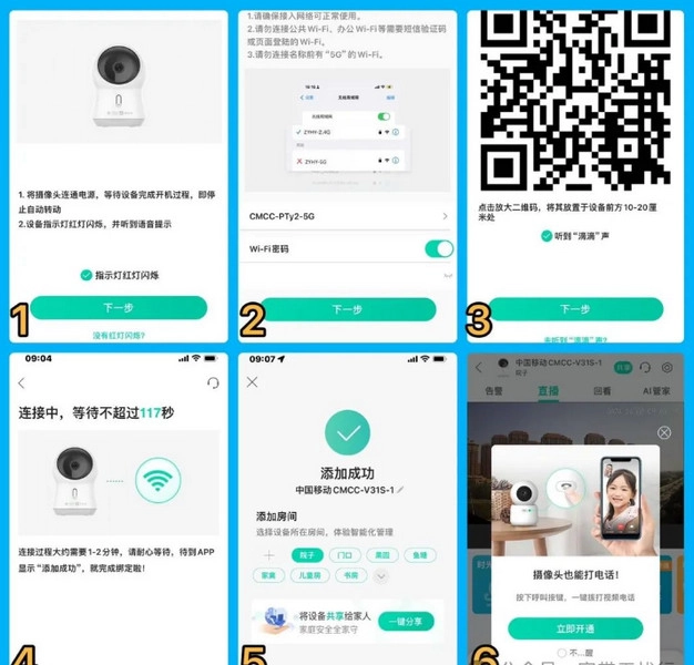 扫码后会自动添加此设备,摄像机指示灯红灯闪且听到语音提示后点下一步,进入无线网连接,确保当前手机已连上无线网,不要连接带“5G”的wifi,最后输入密码点击下一步后手机会出现二维码,使用摄像头扫描二维码,听到“滴滴”声后点下一步等待连接成功: