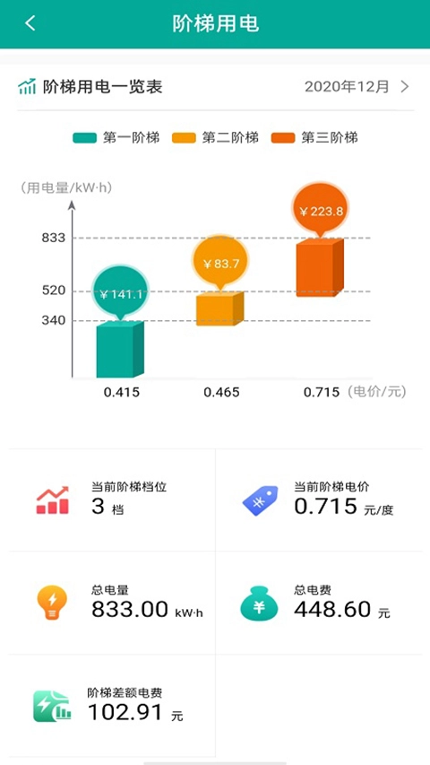 电量电费:呈现近12个月的用电总度数与详细记录,帮助用户清晰了解自身用电状况。