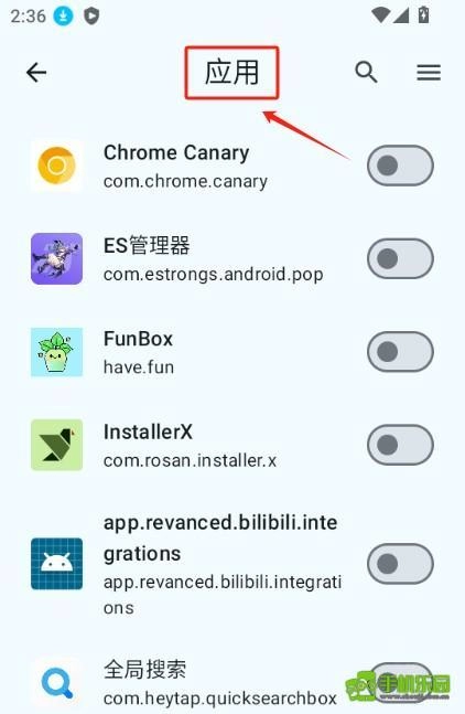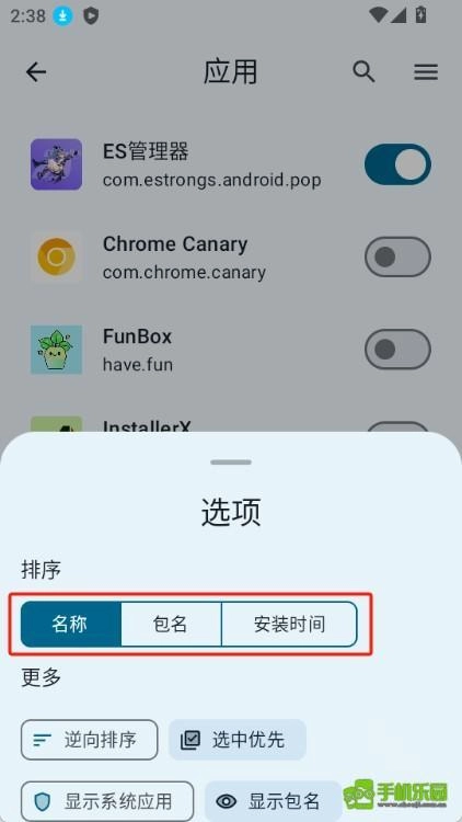 点击右上角的【三】图标,就能按照名称、包名、安装时间等条件进行排序。