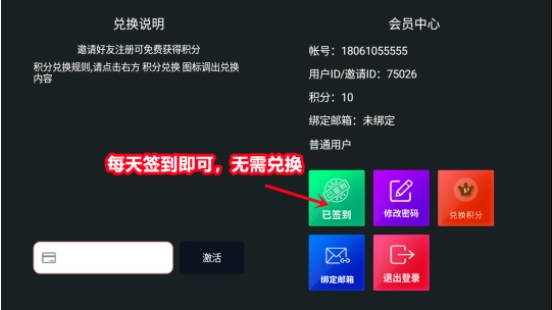 注册账号时仅需填写任意11位数字即可,无需邀请码;每日完成签到能领取1积分,而播放内容会消耗该积分。