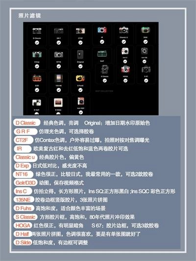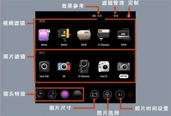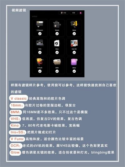 接下来要介绍的是这个功能的核心宝藏区域,按照从上到下的顺序,分别设有视频滤镜、照片滤镜和镜头滤镜这三个菜单栏目。