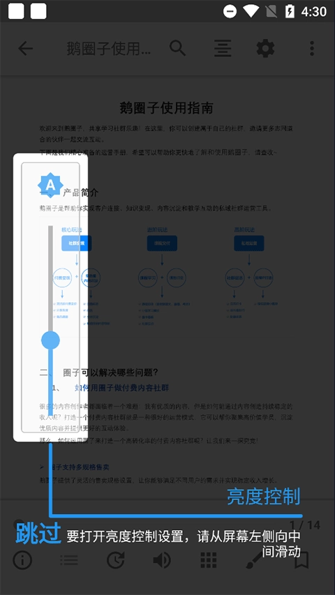 这个阅读应用提供了丰富的设置选项,主要分为三类:可在阅读窗口直接操作的快速设置、高级设置以及常规设置。其中亮度调节功能以小部件的形式呈现,用户能在阅读窗口里直接调出该小部件进行操作。