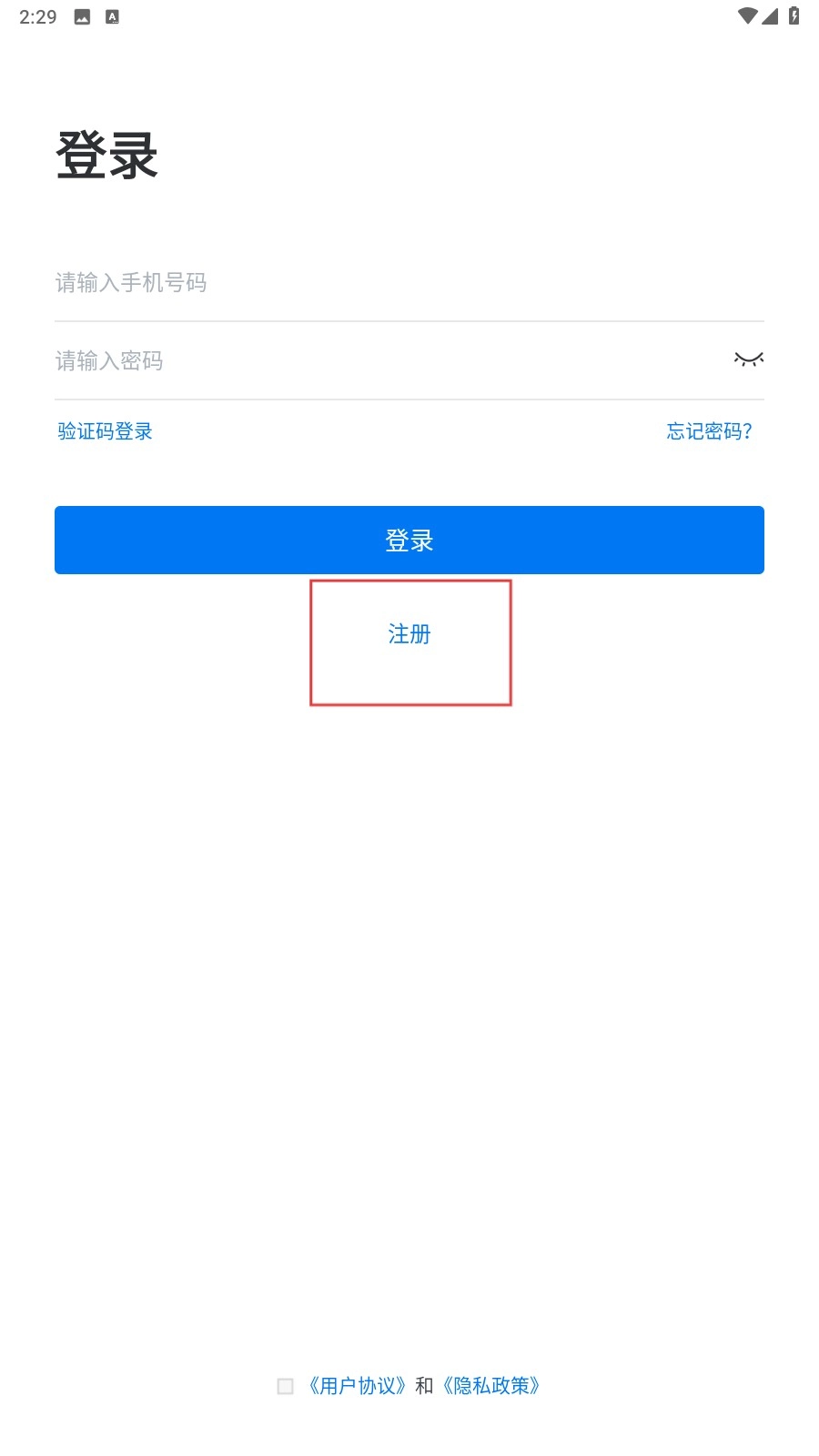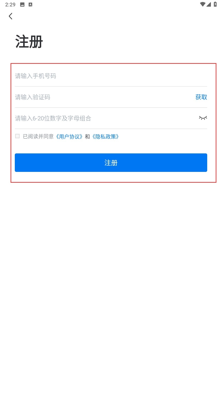 注册时按照要求填写手机号、验证码和密码,勾选相关协议后点击【注册】按钮即可完成注册流程。