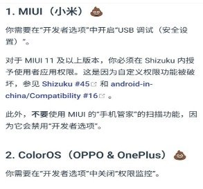 在已授权应用列表里给LSPatch开启权限,重启LSPatch后就能看到Shizuku服务处于可用状态。安卓11及更高版本的系统,只需按照步骤指南通过无线调试来启动Shizuku就行,指南里针对常见厂商机型可能出现的问题都给出了解决方案,我们对照着处理就可以。接下来我会以自己正在使用的小米MIUI系统为例进行说明,另外手机的通知样式需要调整为原生样式。
