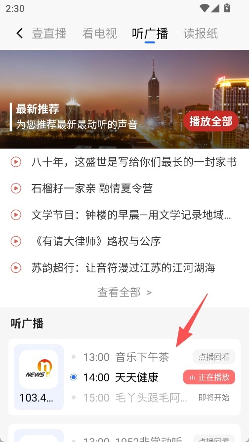 在软件中开启听广播功能,就能收听到推荐的音频内容以及实时的广播节目。
