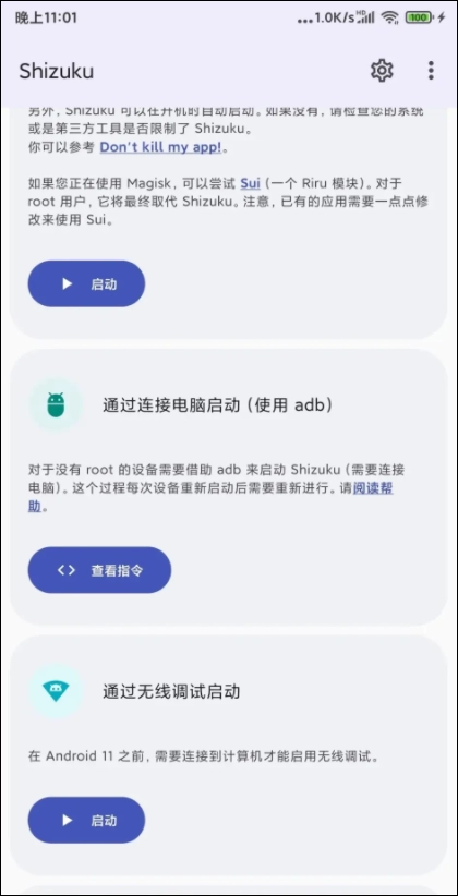 如果你的手机已经获取了ROOT权限,直接授予Root权限就能正常启动;后面两种开启方式都需要先开启开发者模式,再给予USB调试权限。