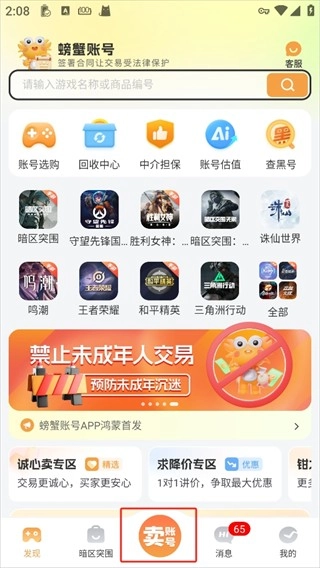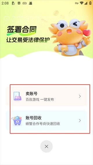 打开螃蟹账号代售App,点击卖账号。