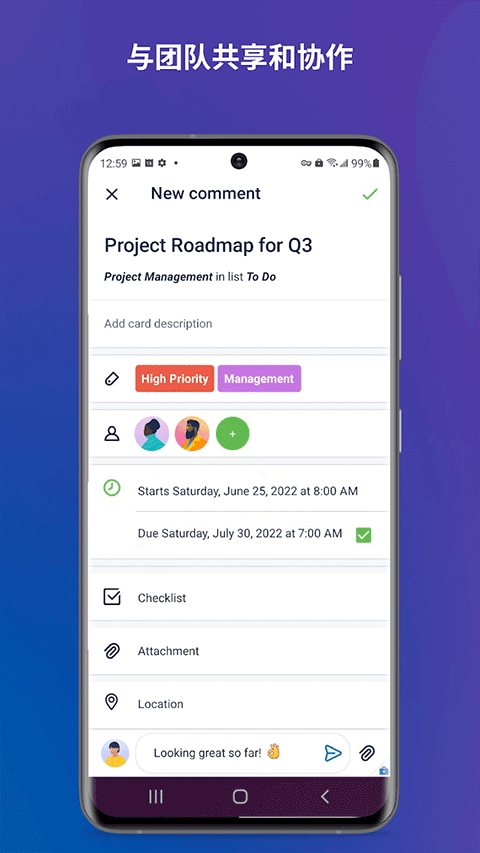 灵活的任务分配:在卡片上添加“待办事项”清单,可便捷地将任务分配给自己或合作人员。