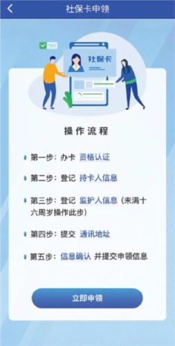 点击【社保卡申领】选项,接着查看社保卡申领的具体步骤,随后按照第五步中的1-3项要求,对申领人开展身份认证工作。
