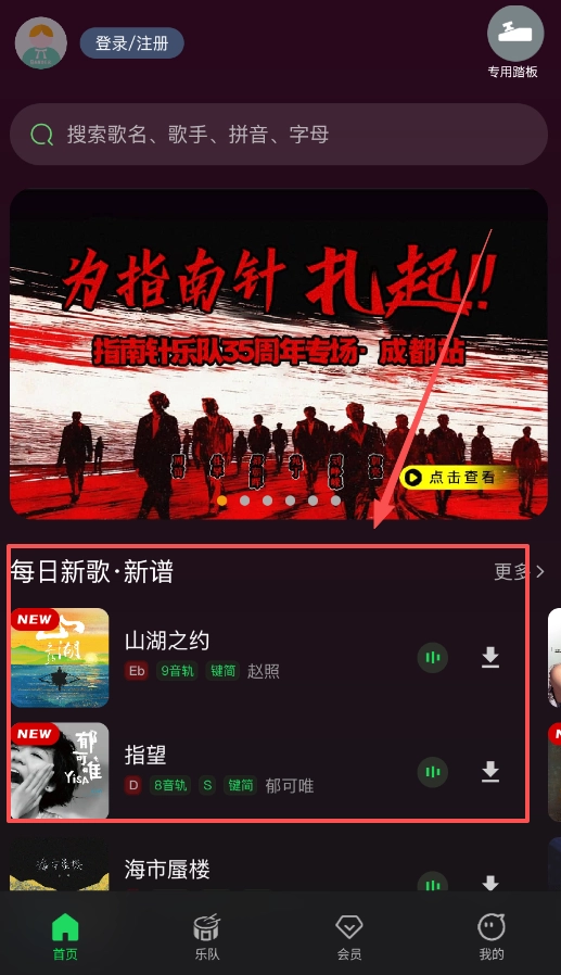 登录后进入首页,您可以直接搜索想要查找的歌曲名称或歌手名字,也能够浏览每日推荐的新歌以及新乐谱,像《山湖之约》《指望》这类热门曲目都包含在内。