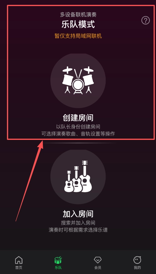 想和朋友一起合奏的话,可以点击底部的“乐队”按钮进入乐队模式,由其中一人创建房间并选择歌曲,其他人在局域网内搜索该房间并加入,就能开始联机演奏了。