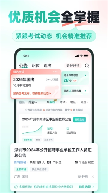 及时:实时捕捉并发布全国最新的公考资讯,借助订阅提醒服务,一对一地为你及时推荐专属的优质职位;
