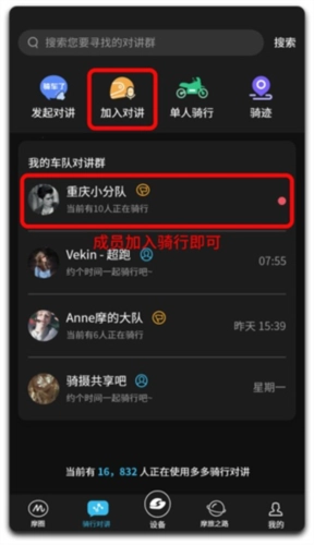 只需要一位成员发起对讲,其他成员加入该骑行即可。