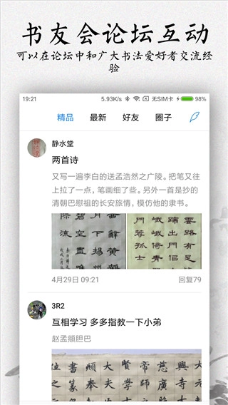 用户能够把自己的书法作品上传到书友会,开展交流与讨论。