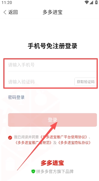 接着安装多多进宝,通过手机号进行注册登录操作,之后完成实名认证并绑定银行卡,这样才能为后续提取佣金做好准备。