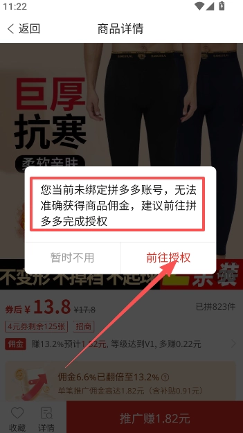 进入商品详情页面后,会看到相关说明提示:需先授权绑定拼多多账号,完成绑定后,后续下单购买该商品才能获得对应的佣金奖励。