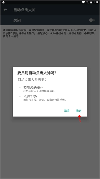 打开后页面弹出一个小窗口,提示“此应用需要激活无障碍服务才能正常工作……”,阅读完毕点击下方的“确认”按钮即可。